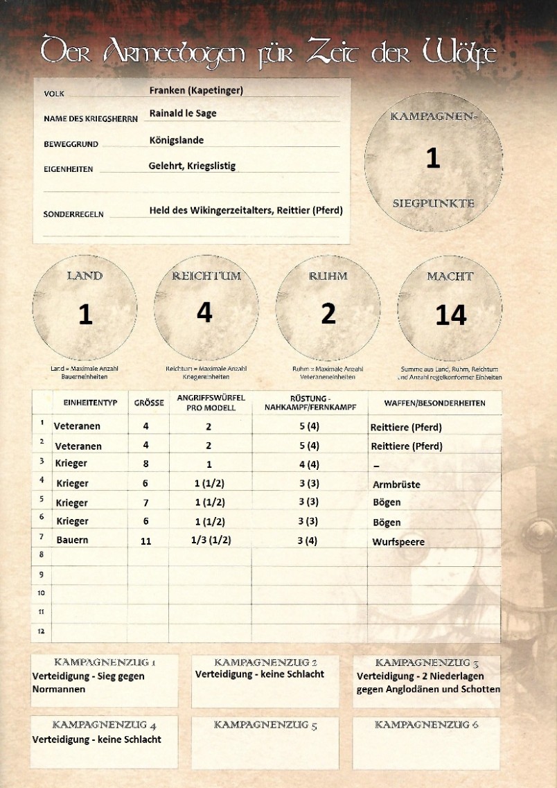 Wie mein großer Ahne Charlemagne, der das Frankenreich begründete und Europa unter seiner Herrschaft und Gottes Segen einte, ziehe ich aus, die noch unter uns verbliebenen Heiden zu bekehrenund sie einerseits mit Klugheit und Überzeugungskunst, aber auch andererseits mit Feuer und Schwert zum einzig wahren Gott und unter die Herrschaft unseres großartigen Reiches zu leiten. Weisheit wird meine Klinge jederzeit führen und das genaue Studium meiner Gegner mein Geschick in den kommenden Schlachten bestimmen. Kein Zweifel wird mich überkommen, denn ich weiß, dass der Allmächtige mich mit außerordentlichen Fähigkeiten gesegnet hat und meine Mission immerdar unter Begleitung seines Segens steht.